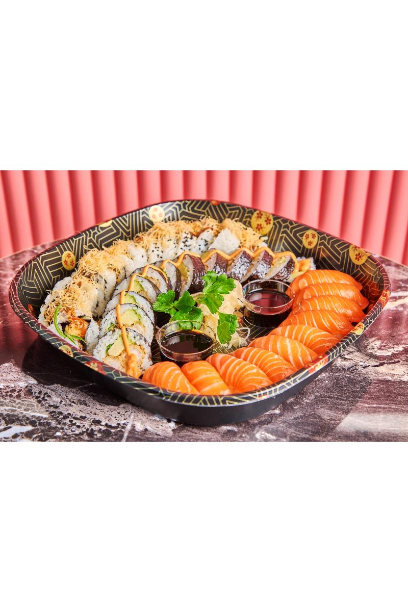 10 stk frambe nigiri laks sushi+12 futo tempura scampi maki m/ chili majo+ 12 foto and maki m/hoisin saus. (F,sk,egg,se,peanøtter)
