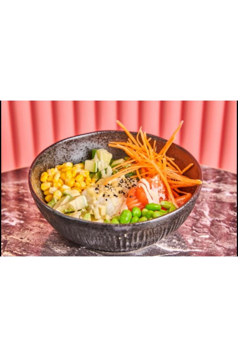 NOK 179.00 Japansk ris med 5 skiver laks ,agurk,mais,avocado,erter,sjøgress og gulrot,majones dresin (F,soyabønner,egg)