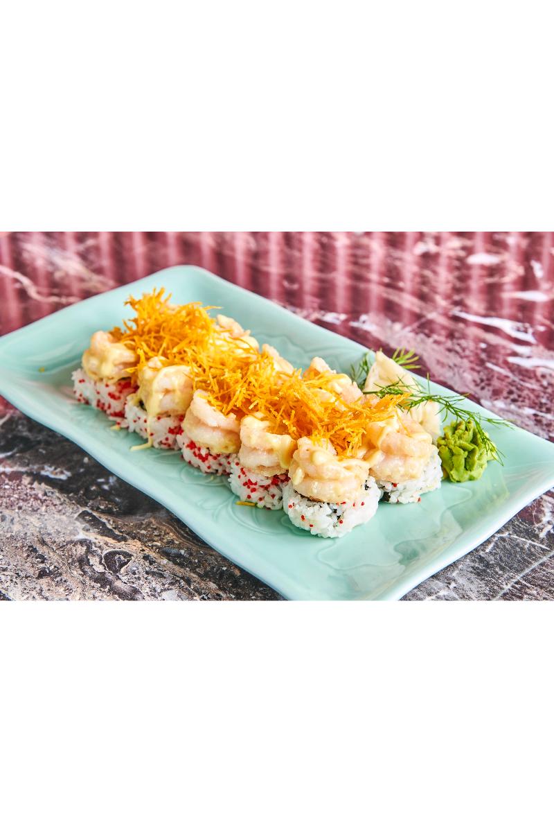 AVOKADO ,AGURK,TOPPET MED SCAMPI ,SØTPOTETER,CHILLIMAJONES , WASABI OG HONNONGAPPELSINSAUS (SK,E,SE,FR)